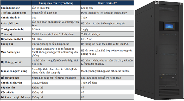 SmartCabinet™ là một phương pháp mới cung cấp giải pháp hạ tầng CNTT toàn diện bao gồm nguồn, hệ thống quản lý nhiệt, vỏ, hệ thống phân phối điện, mạng lưới giám sát và quản trị hạ tầng, tất cả được tích hợp đầy đủ chỉ trong một giải pháp trọn gói đơn giản. Đây là giải pháp toàn diện tích hợp hàng đầu, có thể đưa vào hoạt động ngay lập tức mà không cần thiết lập các phòng máy phức tạp, qua đó rút ngắn tốc độ triển khai so với phương pháp truyền thống. SmartCabinet™ được thiết lập cấu hình và cài đặt sẵn, đồng thời đã thông qua quá trình kiểm tra nghiêm ngặt tại nhà máy để đảm bảo tính tương thích hệ thống và sẵn sàng sử dụng ngay từ ngày đầu tiên.